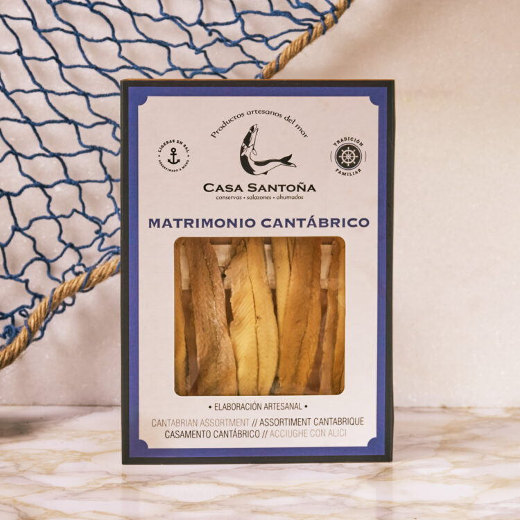 El Matrimónio del Cantábrico de Casa Santoña es una exquisitez que los amantes del mar deben probar. Combina las mejores anchoas y boquerones del Cantábrico para una experiencia única.